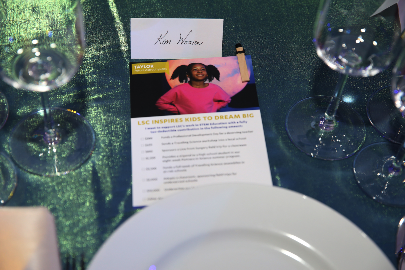 Before the program began, attendees were given cards that highlighted young scientists who have been inspired by the Science Center, such as 8-year-old Taylor who dreams of being an astrophysicist, and 7-year-old Benjamin who dreams of being an engineer. These cards served as a reminder of LSC’s mission and what the Gala is all about: to inspire the next generation of scientists and engineers and excite learners of all ages about the power, promise, and pure fun of science and technology.