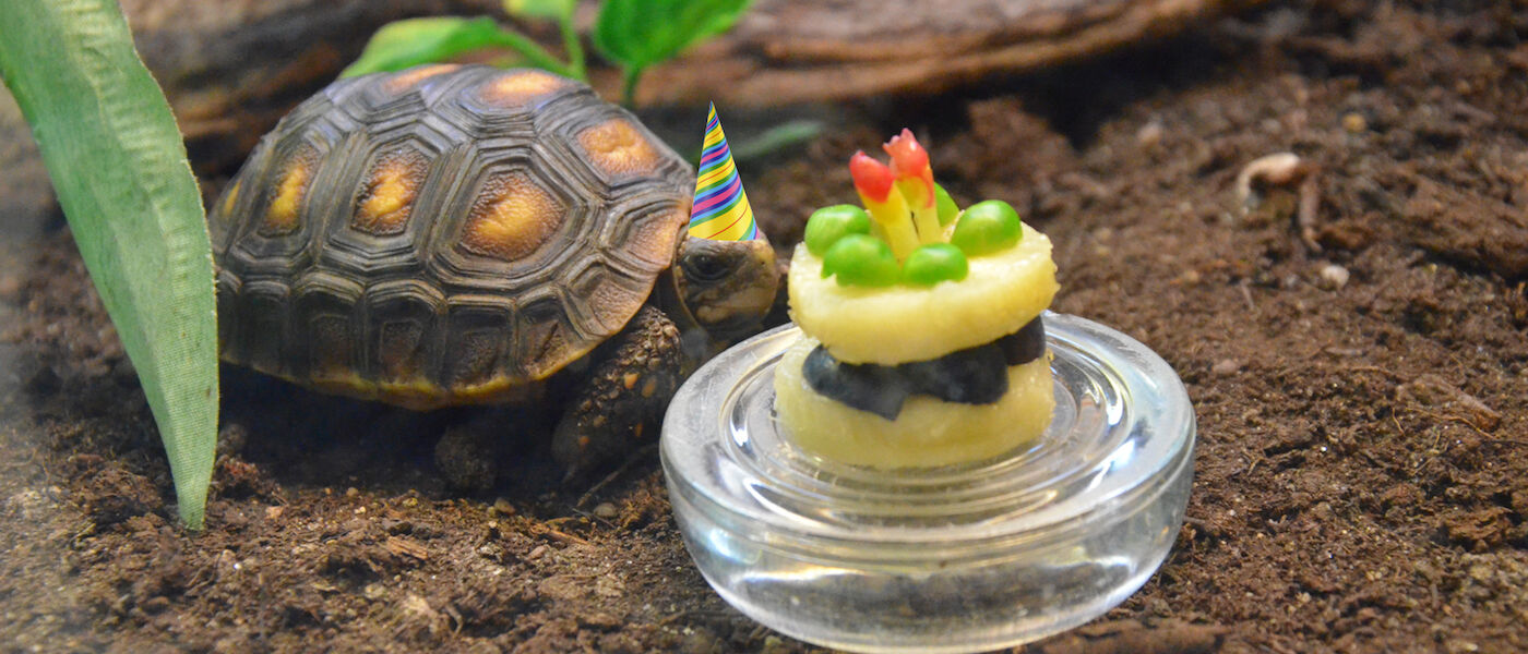But don't call it a birthday party! Six years ago this weekend, the juvenile red-footed tortoise came from an egg that was incubated and hatched right here at the Science Center. And so therefore we celebrate his "hatch day," not birthday.